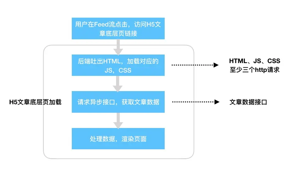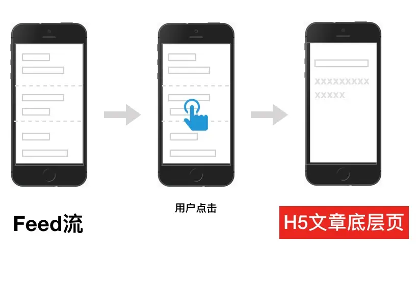 信息流App是当下最流行的产品之一,如今日头条等。我所在的团队也是在做这样一款信息流App。App的Feed流是客户端Native实现的。用户点击Feed流中的文章后,会进入到文章底层页。文章底层页大部分都是Native实现的,但是有一些文章的数据是非结构化的,Native没有办法很好地处理,所以用H5页面来承接这部分文章。整个业务场景很简单,用图表示如下: