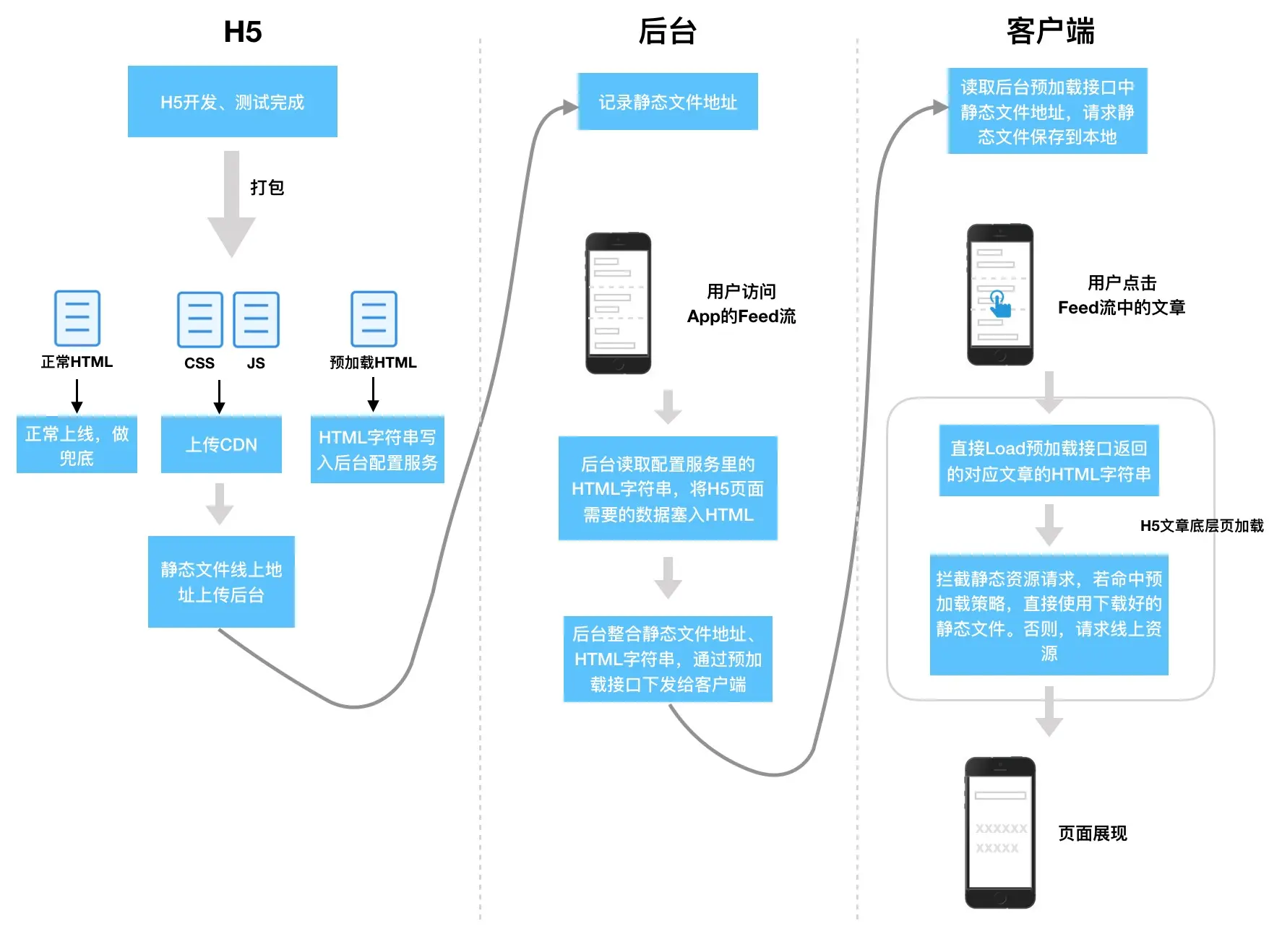 - 前端在开发上线打包时,产出两个HTML模板文件,一个用于之前的逻辑,一个用于预加载逻辑。预加载HTML已字符串的形式写入后台的配置服务。将产出的js,css文件上传cdn,并且将cdn地址上传到后台保存。