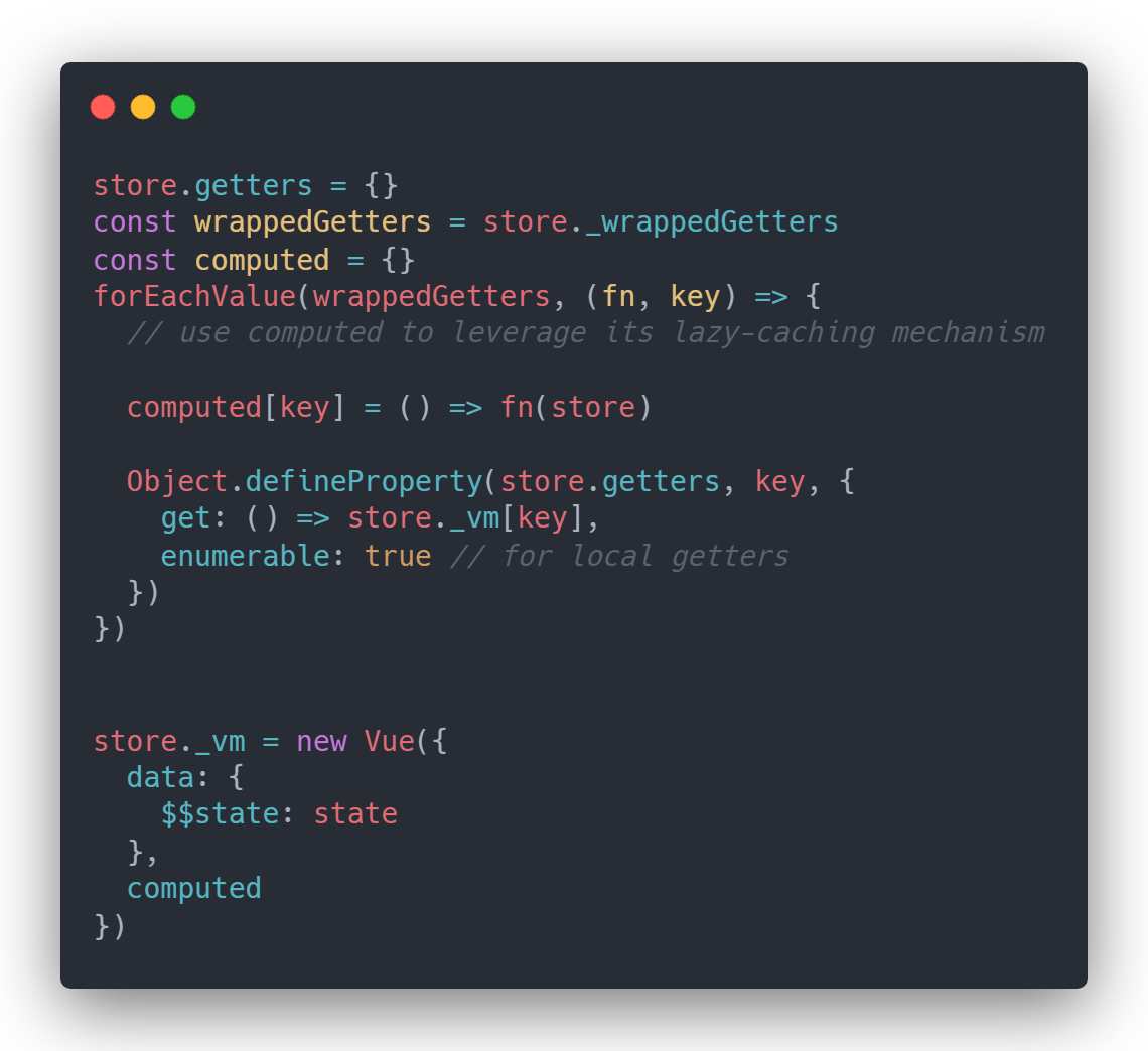 这里再介绍一下 Vuex 中的 getters,它们最终都会变成内部 Vue 实例的 computed 属性, 当某个 getter 依赖的值发生变化会触发重新计算,从而执行 fn(store) 这个函数,store 是的 Store 实例,而 fn 又是什么呢?在安装模块时,会定义 store._wrappedGetters 这个对象,fn 就是 wrappedGetter 这个函数
