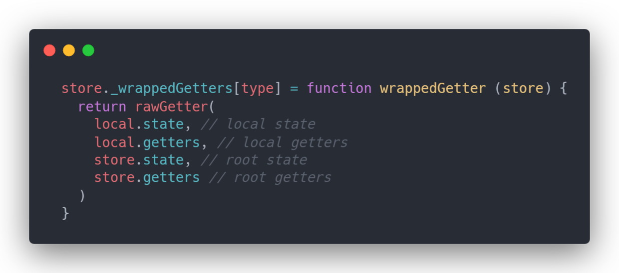 根据官方文档可以发现,每个 getter 支持 4 个参数,当前模块的 state,当前模块的 getters,全局的 state,全局的 getters,对应 rawGetter 的 4 个参数(rawGetter 即开发者定义的 getter 函数)
