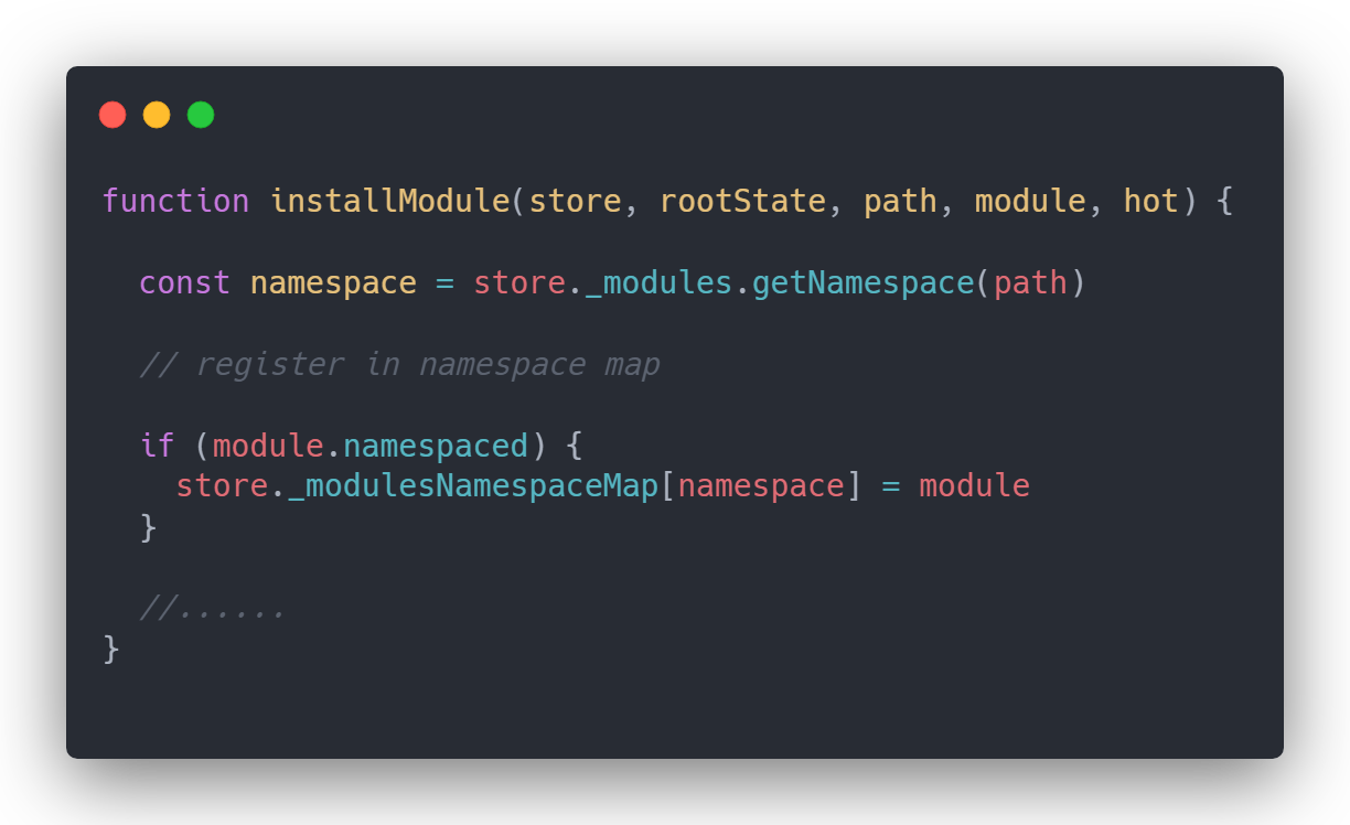 介绍模块树 ModuleCollection 时提到它有一个 register 方法,通过传入的 path 数组和模块,插入到模块树中对应的位置,正好对应 registerModule 的 2 个参数,而 registerModule 在将模块插入到整个模块树之后,还会给传入的模块执行安装模块的函数,以及重置 Vue 实例