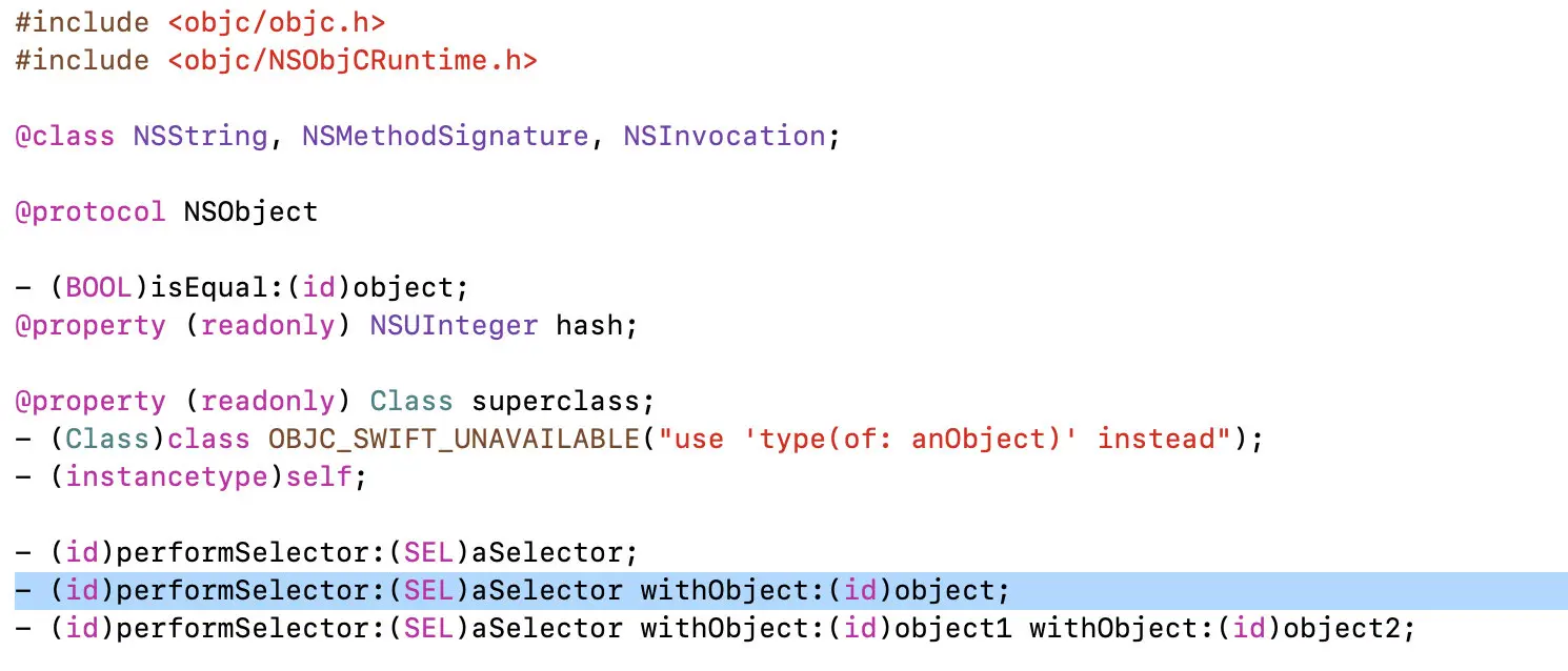 performSelector:method is equivalent to sending anaSelectormessage directly to the receiver. For example, the following messages all do the same thing:id aClone = [anObject copy]; id aClone = [anObject performSelector:@selector(copy)]; id aClone = [anObject performSelector:sel\_getUid("copy")];The