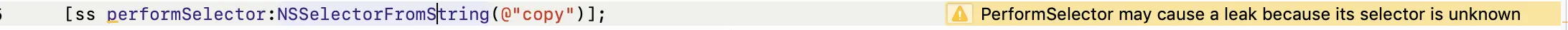 内存管理策略中有一条是:谁创建谁管理。假入我们调用的selector为copy等会创建实例的方法。而且这个操作在编译期间是无法通过ARC来实现内存管理的(也就是说创建的对象没有被进行自动内存管理),这时是存在内存泄漏的可能的。所以会给出内存泄漏的提示!
