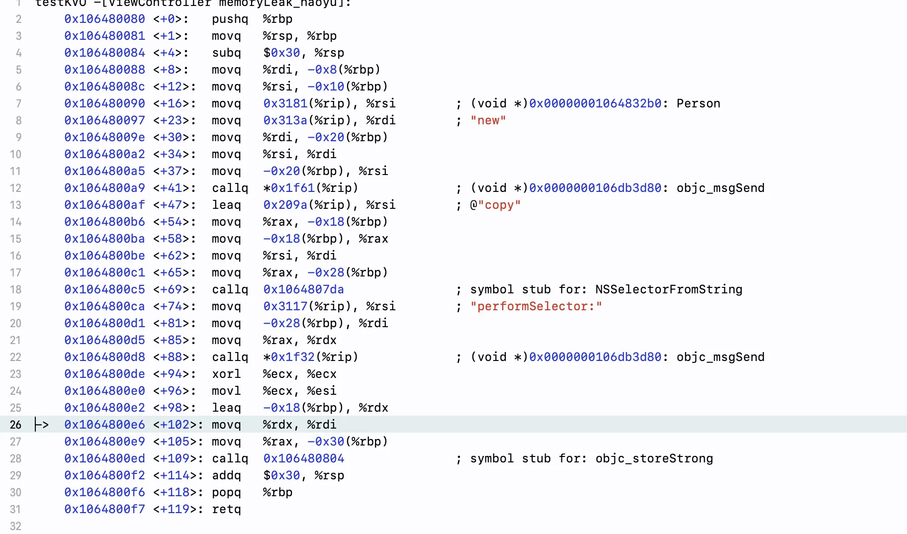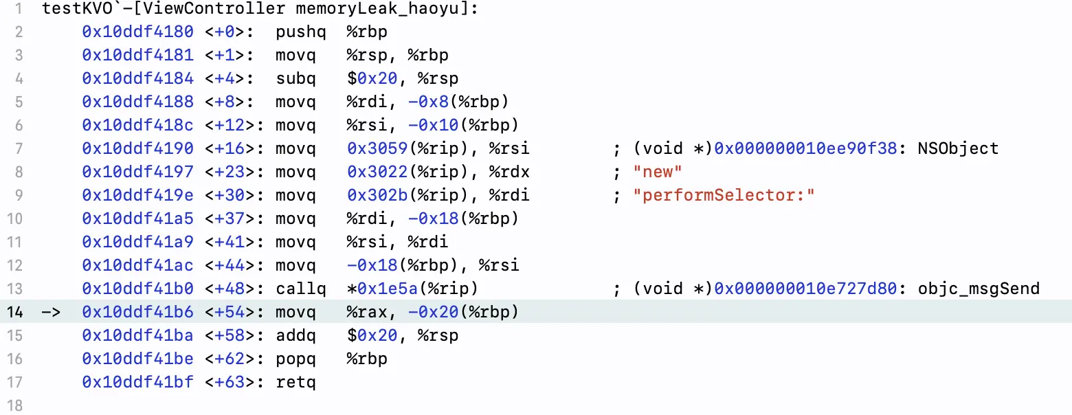 上图中我们可以看到并没有objc_release()的调用。创建的对象没有被释放掉,我们看下正常情况下汇编后的结果(可以看到最后是有callq objc_release 操作):