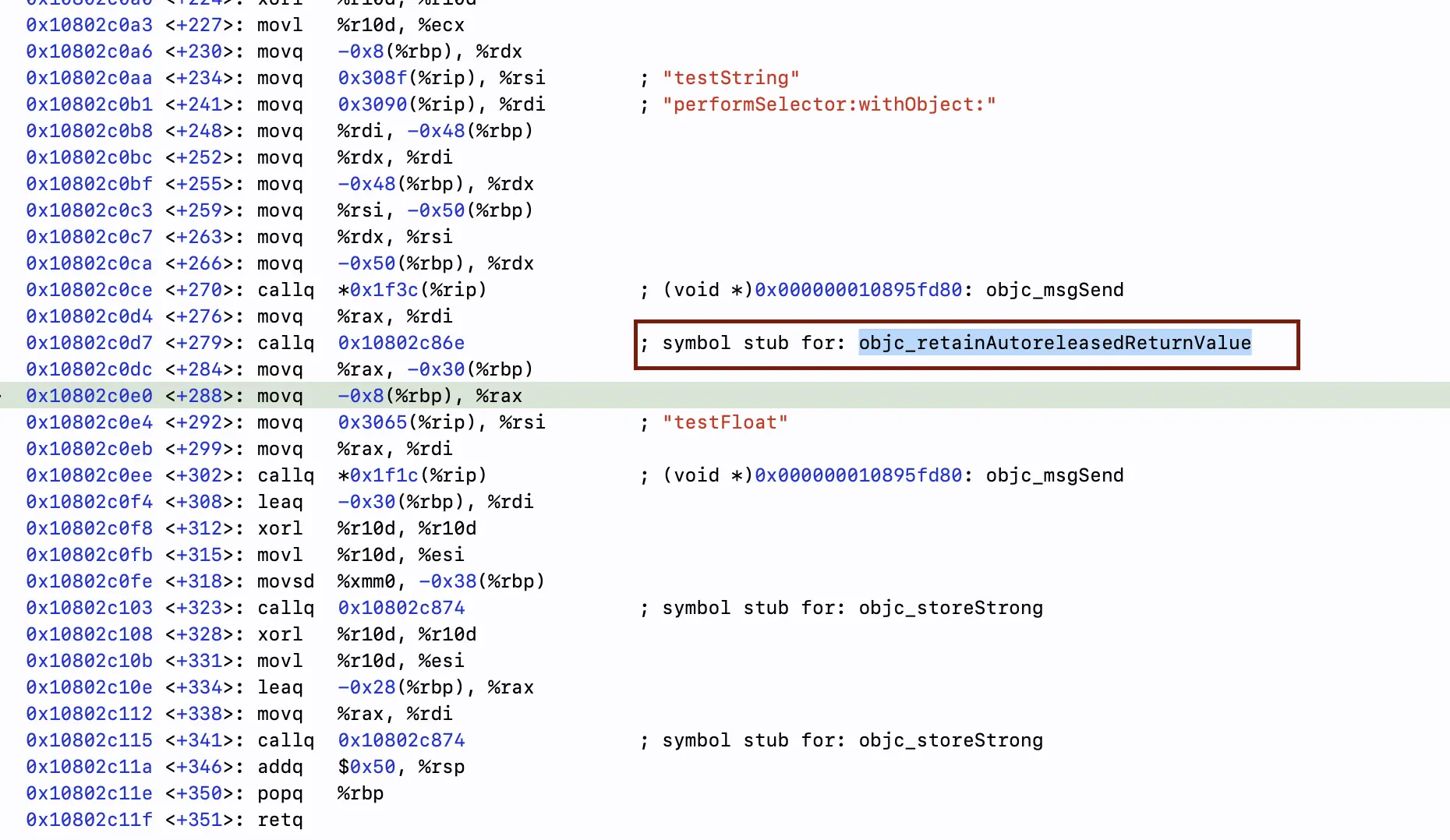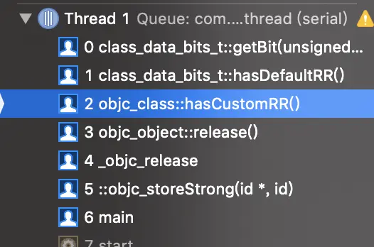 而performSelector:在运行时会转换成objc_msgSend()调用,如果此时方法的返回值为结构体,而这时通过objc_msgSend()来调用,编译器会认为返回值为为一个对象类型,因此会为返回值添加优化: objc_retainAutoreleasedReturnValue。
