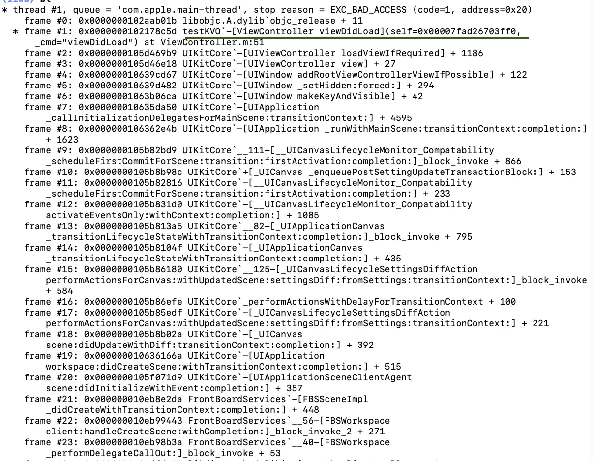可以看到是调用performSelector的对象释放时出现crash。这里我们看一下是哪个对象的释放引起crash。