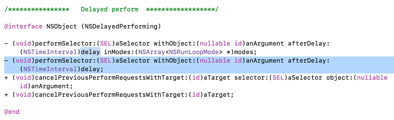 performSelector 系列API 分别位于不同的分类中: