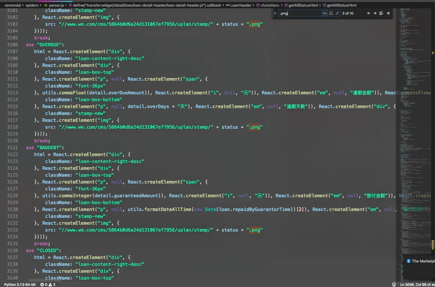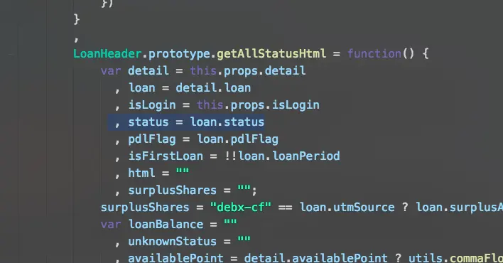 还有想获取什么信息直接看那个js代码即可,我就不再分析了,不过我客户有个需求是获取散标状态,也就是散标是否还款完、违约等状态,不过那个信息是张图,所以我们需要接着分析js,这里是个switch(我不会js,ase应该是类似case)