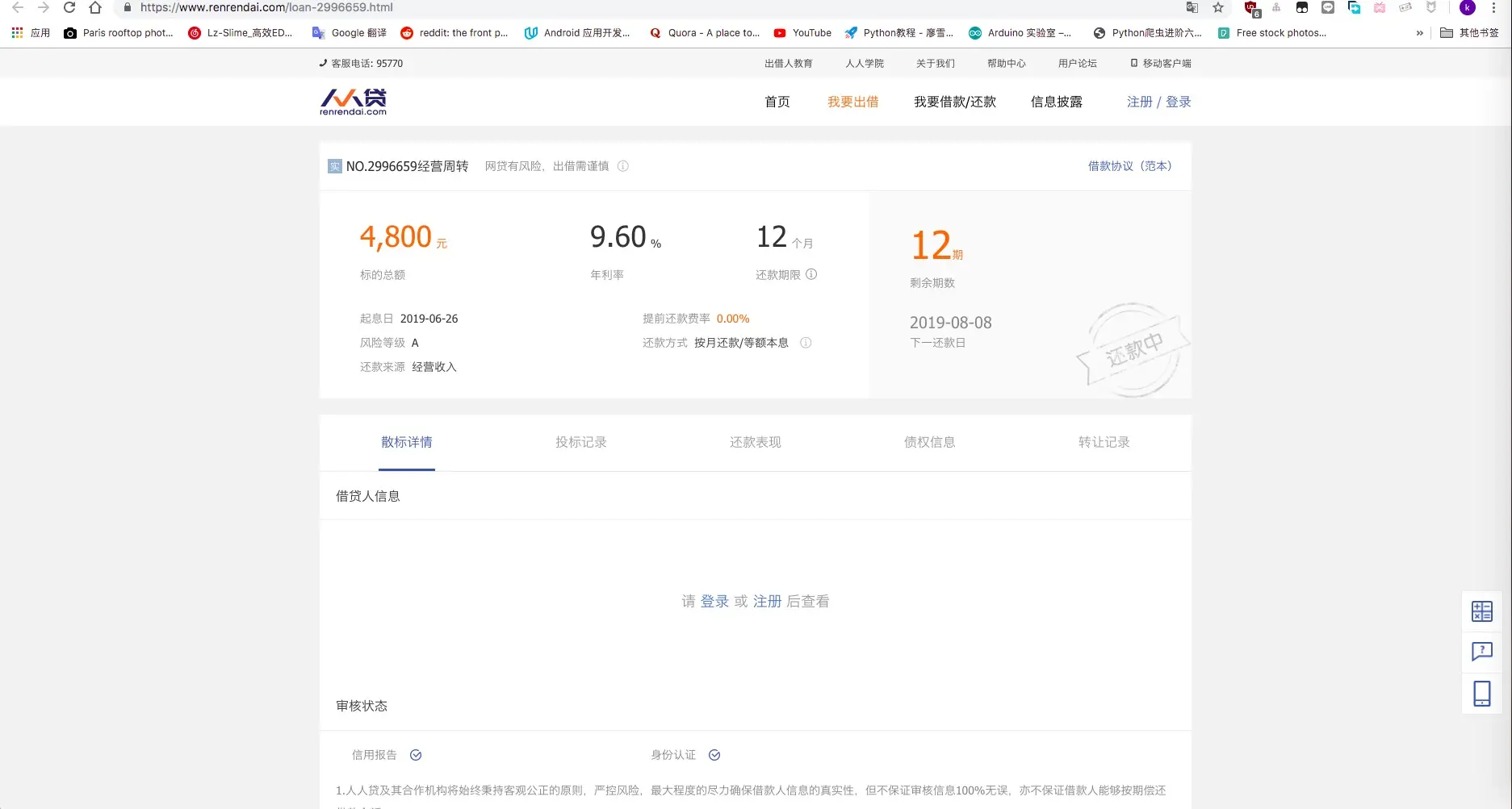 在抓取每个网站前肯定是需要分析它的结构的,我随便点了一个最新的散标网页,如下图可见没登陆仅能显示一小部分信息