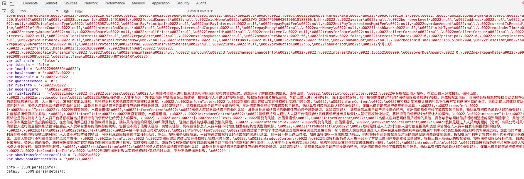 2、接着用json.loads对其转换,不过在此之前先得把其中得unicode给转换一下,因为从requests获取到的都是直接转义过了的,所以我直接写了一个方法,其中的内容仅针对人人贷散标网页