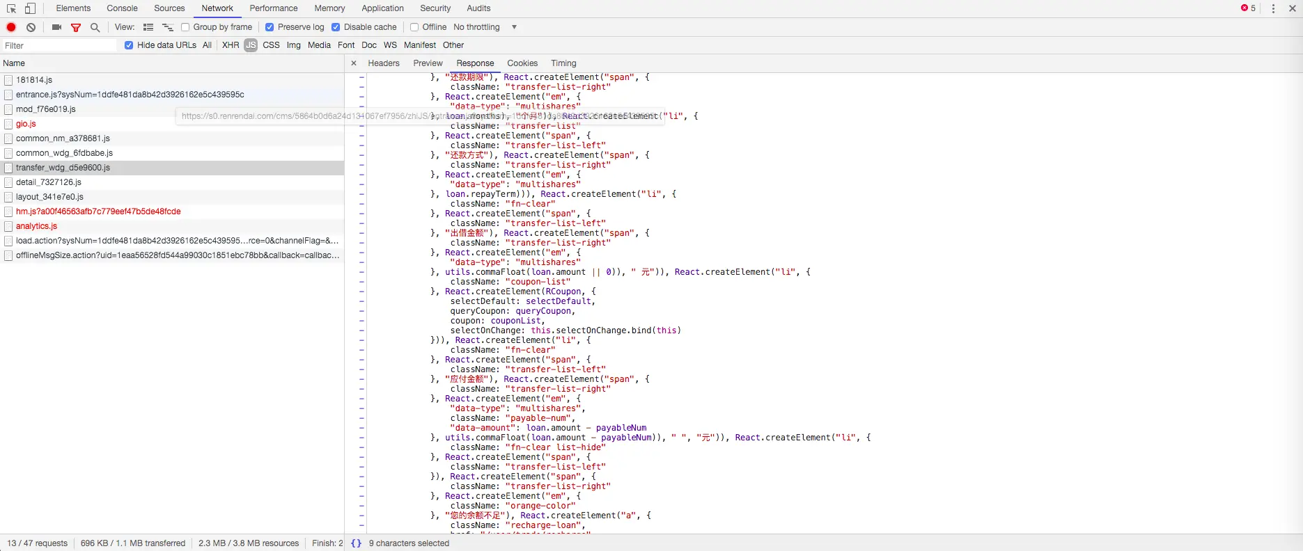 那么只需要用正则获取到这些json然后解析就能获取其所有信息,不过目前还不知道哪些 key 代表哪部分信息,不过想了一想,既然所有信息都返回了那肯定有对应的js来解析,接着我从之前刷新的内容中发现一个js文件就是需要的