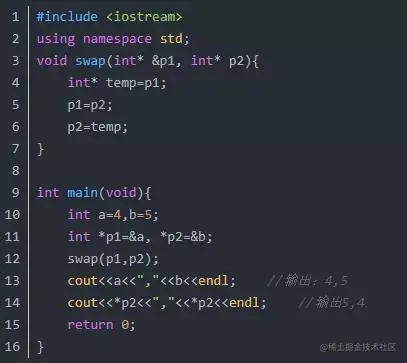 其中不可以直接写成swap(&a,&b),而必须用指针变量p1和p2存放&a和&b,然后把指针变量作为参数传入.
