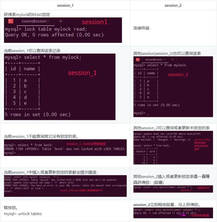 Query OK, 0 rows affected (0.00 sec)读锁案例:下面通过两个会话窗口来演示对mylock表加读锁之后的效果: