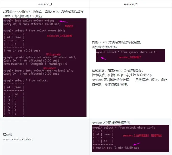 - 2、对MyISAM表的写操作(加写锁),会阻塞其他进程对同一表的读和写操作,只有当写锁释放后,才会执行其它进程的读写操作。