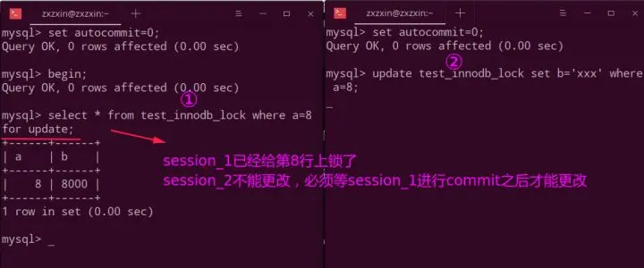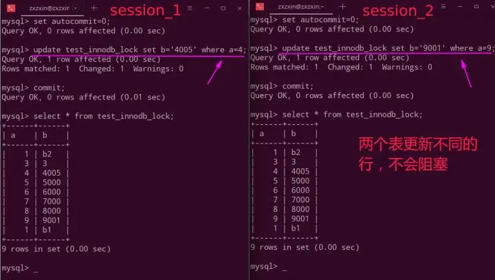 如果不是更新同一行,则就算在session_1没有commit的时候,session_2也不会阻塞。