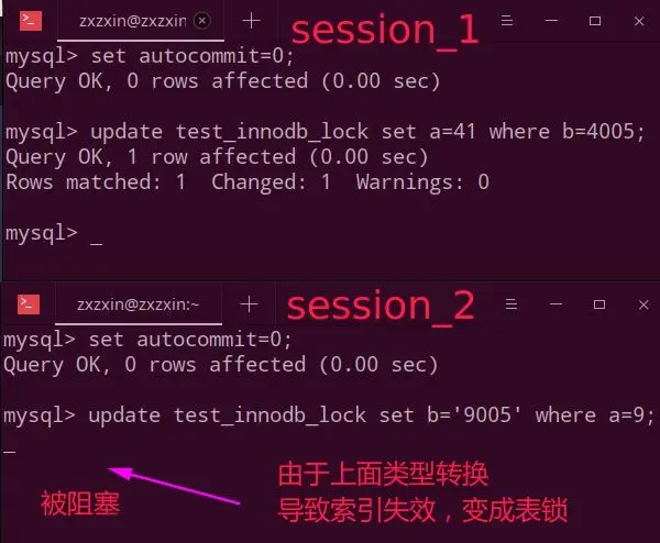 举个例子: 因为我们的b是varchar类型的,更新的时候我故意将b的单引号去掉,此时MYSQL底层自动类型转换,但是此时就会导致索引失效,然后我们看下面,就会导致我们的行锁变成了表锁,从而导致阻塞等待。