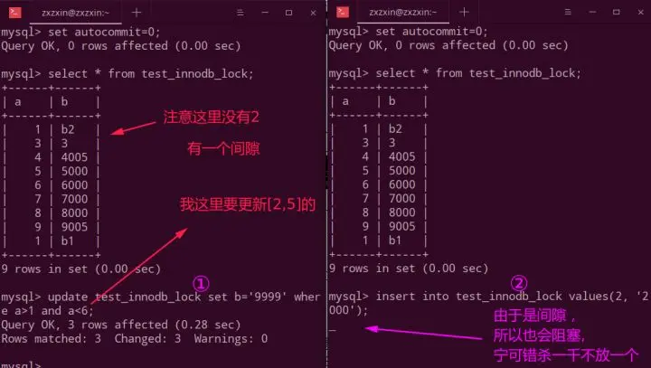 间隙锁有一个比较致命的弱点,就是当锁定一个范围键值之后,即使某些不存在的键值也会被无辜的锁定,而造成在锁定的时候无法插入锁定键值范围内的任何数据。在某些场景下这可能会对性能造成很大的危害。