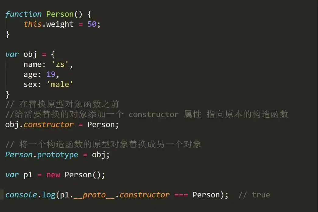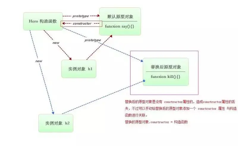 替换原型对象的方式会导致原型的constructor的丢失,constructor属性是默认原型对象指向构造函数的,就算是替换了默认原型对象,这个属性依旧是默认原型对象指向构造函数的,所以新的原型对象是没有这个属性的。