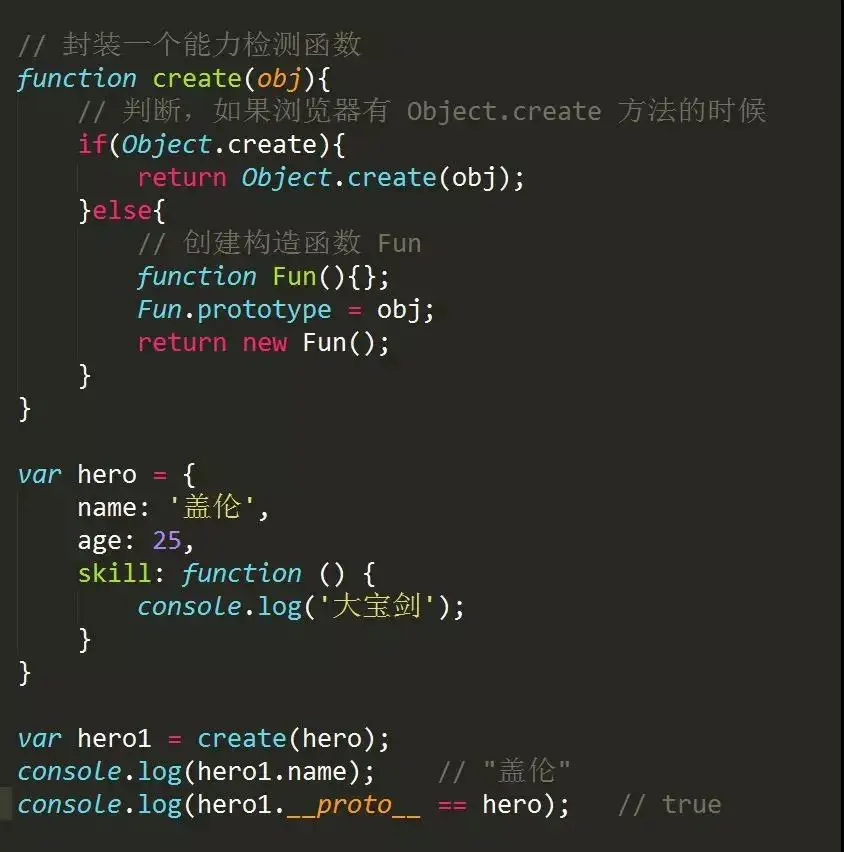利用浏览器的能力检测,如果存在Object.create则使用,如果不存在的话,就创建构造函数来实现原型继承。