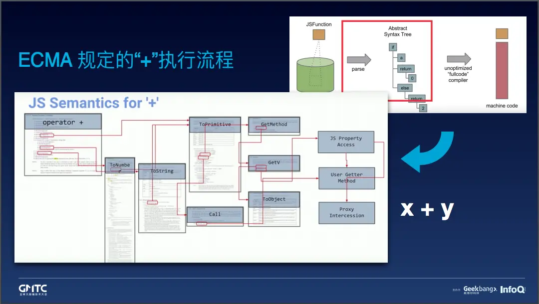 The beginning of the talk covered where the bottlenecks in JS come from, not just parsing and optimizing JS code, but also the JS language specification itself. This slide captures all the work involved adding two numbers in JS.
