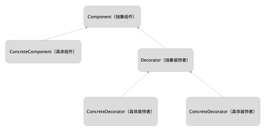 Component(抽象组件): 是具体组件和抽象装饰类的共同父类,声明了在具体组件中实现的方法。比如第一部分的List ConcreteComponent(具体组件): 抽象组件的子类,实现抽象组件的方法,装饰器可以给他加新的功能。比如ReadOnlyList Decorator(抽象装饰者): 抽象组件的子类,用来装饰具体组件或者装饰其他装饰组件 ConcreteDecorator(具体装饰者):抽象装饰类的子类 具体的可以看下面的结构图: