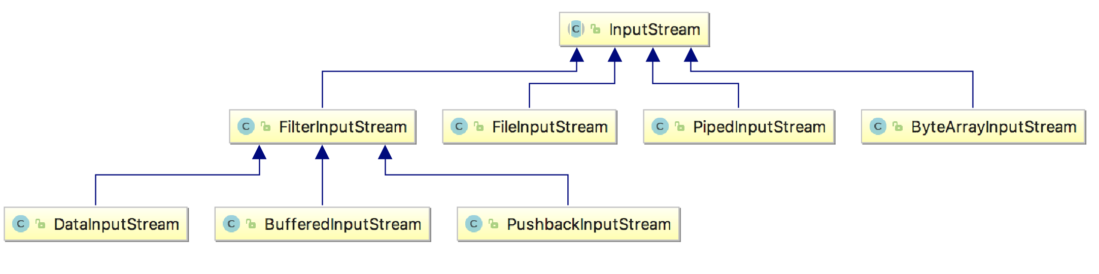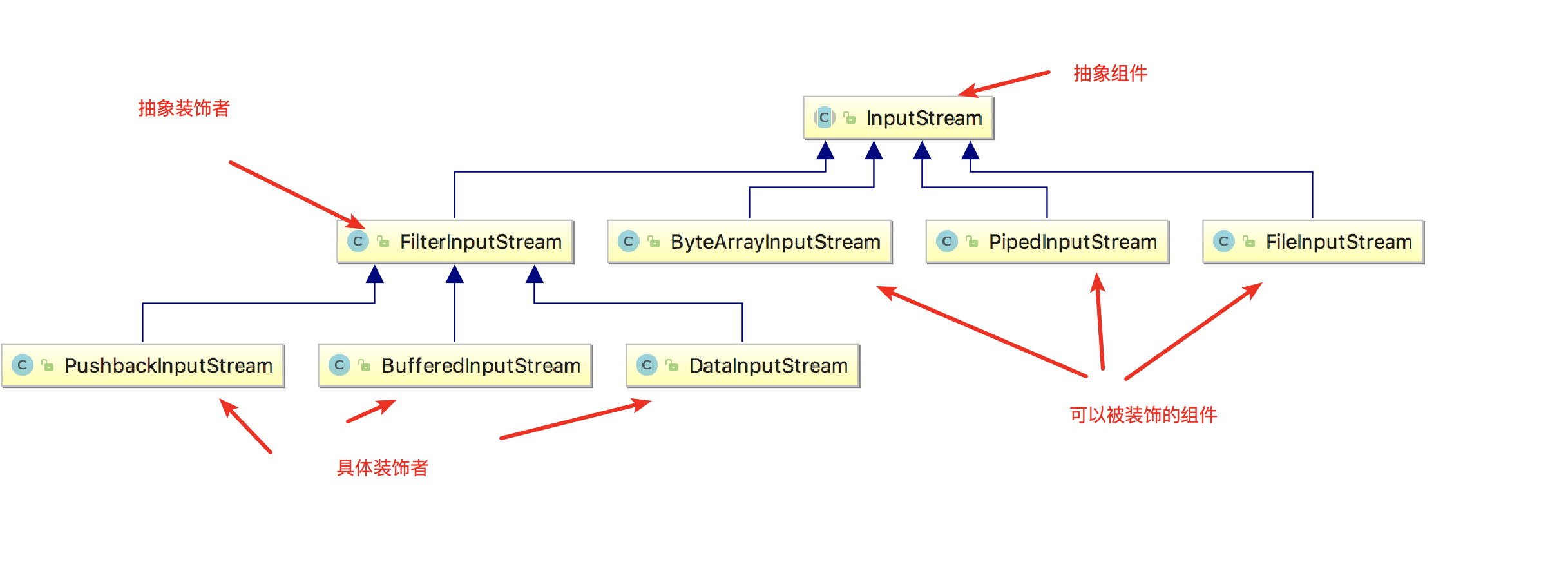 我们以输入流来分析,首先InputStream 相当于我们的抽象组件,FileInputStream、StringBufferInputStream、ByteArrayInputStream都是可以被装饰者包装起来的组件,FilterInputStream相当于抽象装饰者,PushbackInputStream、BufferedInputStream、DataInputStream和LineNumberInputStream都是具体的装 饰者