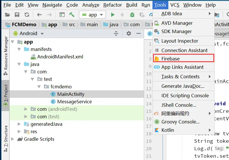 - 在第3步中,我们需要新建一个MessageService继承于FirebaseMessagingService.