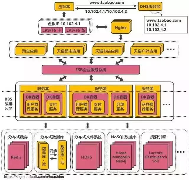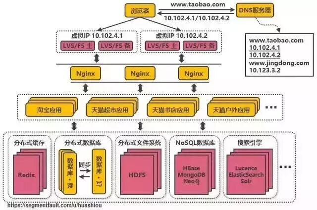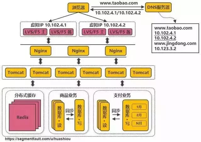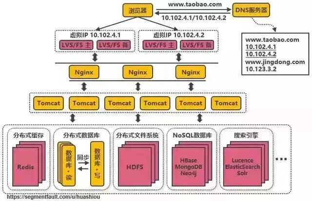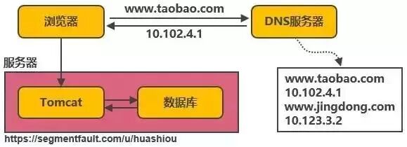 以淘宝作为例子。在网站最初时,应用数量与用户数都较少,可以把Tomcat和数据库部署在同一台服务器上。浏览器往www.taobao.com发起请求时,首先经过DNS服务器(域名系统)把域名转换为实际IP地址10.102.4.1,浏览器转而访问该IP对应的Tomcat。
