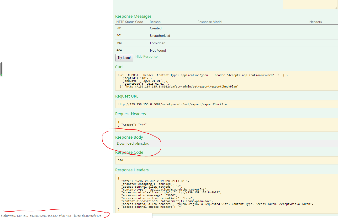 在swagger和谷歌浏览器里面点击下载文件的截图如下