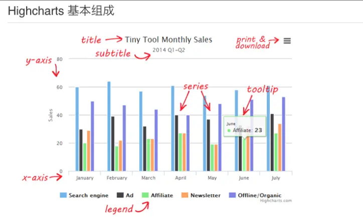 项目需求,要在小程序中加入一个折线图来展示两个数据的变化。因为我之前一直是写pc端的,而且用的highcharts,所以现在记录一下用echars的问题。 我觉得hightcharts相对于echarts来说,他有每个部分代表什么的一张图,如下:
