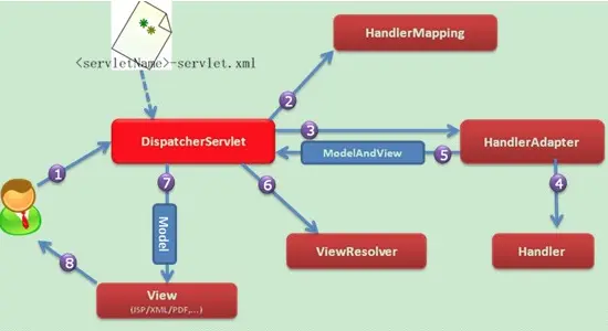 ⑦ 当得到真正的视图对象后,DispatcherServlet会利用视图对象对模型数据进行渲染。 ⑧ 客户端得到响应,可能是一个普通的HTML页面,也可以是XML或JSON字符串,还可以是一张图片或者一个PDF文件。