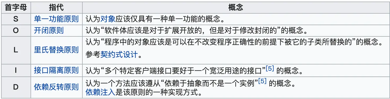 SOLID(单一功能、开闭原则、里氏替换、接口隔离以及依赖反转)指代了面向对象编程和面向对象设计的五个基本原则。