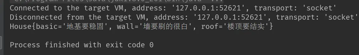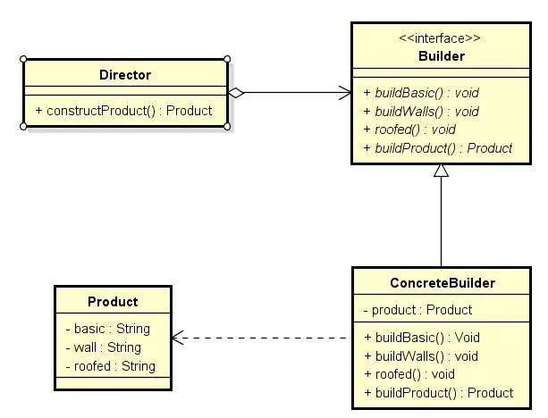 本例中房子有地基,墙,屋顶三个属性,而建房子就是组装这三个部件,组成一个房子,也就是三个步骤:打地基,砌墙和建屋顶,然后在HouseBuilder中要提供一个对外的接口,将建好的House交出去,就是build()方法。