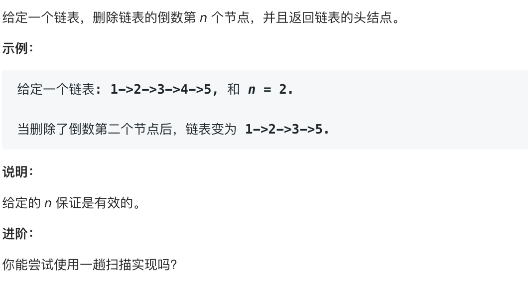 - 让前面的指针先移动n步,之后前后指针共同移动直到前面的指针到尾部为止
