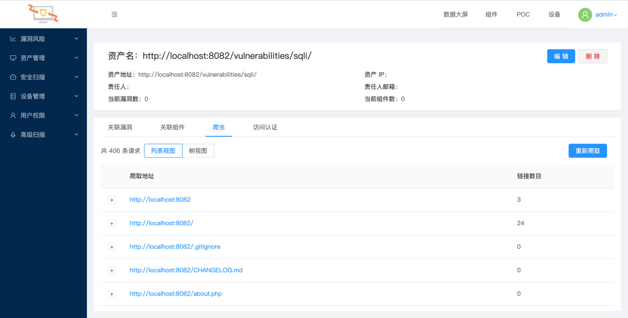 这里我们可以以 DVWA 作为测试目标,在输入框内输入 http://localhost:8082/ 然后执行爬取,即可得到如下结果: