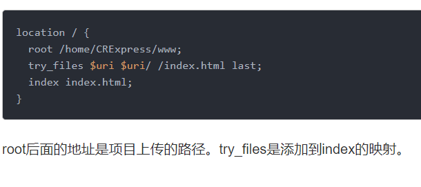 vue项目 Nginx配置 Cissy41334 2019-06-27 625 阅读1分钟 修改配置文件需要做两件事 1、把Nginx服务器的默认路径改成我们项目所在的路径。 2、如果你的vue工程用的路由是history模式,需要将客户端发来的url重定向到默认的index.html,才能正常访问。否则只能看到主页。刷新或点击其他页面都会404。 在配置文件中的server里如下修改。