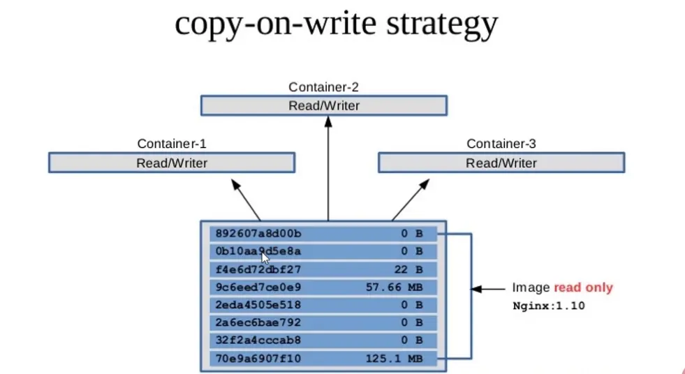 Docker镜像是一个特殊的文件系统,除了提供容器运行时所需的程序,库,资源,配置等文件外,还包含了一些为运行时准备的一些配置参数(如匿名卷,环境变量,用户等)。镜像不包含任何动态数据,其内容在构建之后也不会被改变。docker镜像只需要一个基础的base Image,按照需求不断的叠加就可以了。共享一份基础的。一个基础镜像出现多个容器,如果容器内的etc文件被修改,但是基础镜像的是不会被改变的。修改只会在单个的容器内。 例如要安装一个tomcat镜像,新的镜像是在基础的linux下一层一层叠加上来的。 - Docker的copy-on-write特性