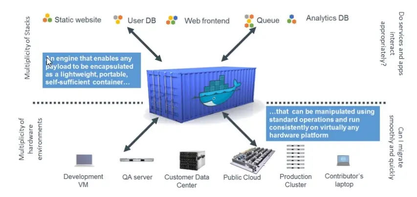 集装箱,无论你是什么货物,钢琴,香蕉,保时捷,他都会放置在各自的集装箱里面了,它都会密封,只有到达目的地才会被打开,标准的集装箱会被高效的装卸重叠,长途运输。docker就将集装箱的思想运用在了打包软件上面。它为代码提供了容器的标准化的运输系统,docker会将任何应用打包成为一个轻依赖,可移植,自包含的容器,这个容器几乎可以运行在任何的操作系统上,其实集装箱和容器对应的单词都叫container,docker的图标就是一个鲸鱼顶着多个集装箱。
