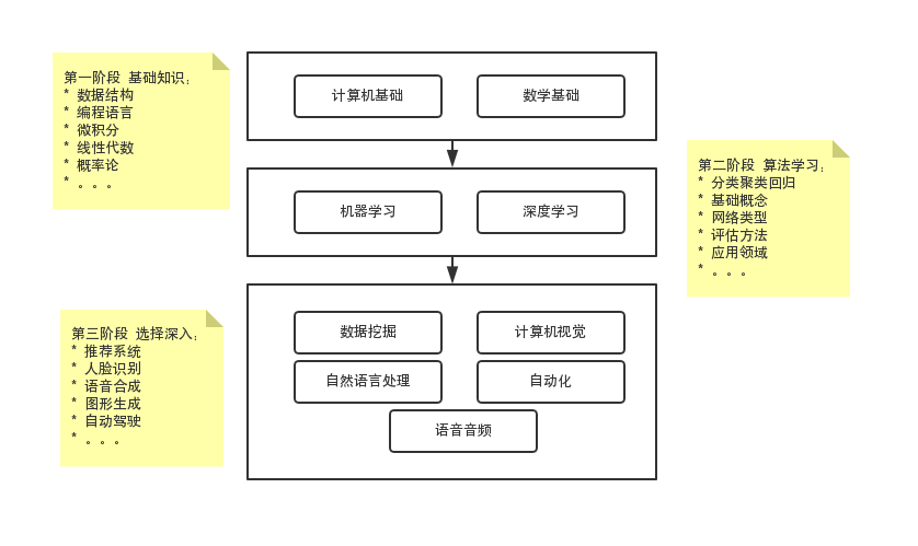 ④最后需要对人工智能有全局的认知,包括机器学习、深度学习两大模块,相关的算法原理、推导和应用的掌握,以及最重要算法思想。