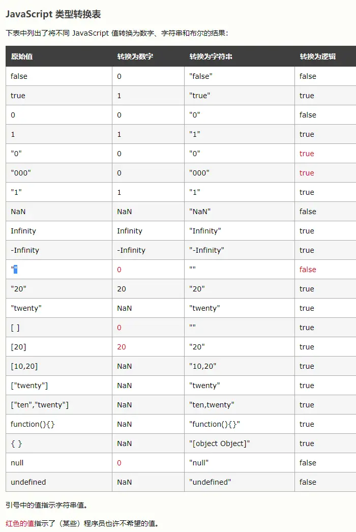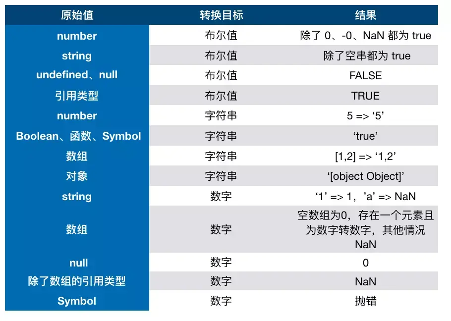 // 字符串和数字比较,字符串转数字 // 布尔与数字比较,布尔转数字 // 字符串和布尔比较,都转成数字 - 判断其中一方是否为 object 且另一方为 string、number 或者 symbol,是的话就会把 object 转为原始类型再进行判断