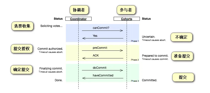 三阶段提交协议将二阶段提交协议的“提交事务请求”过程一分为二,形成了由Cancommit,Precommit,Docommit三个阶段。