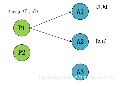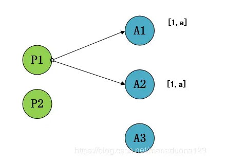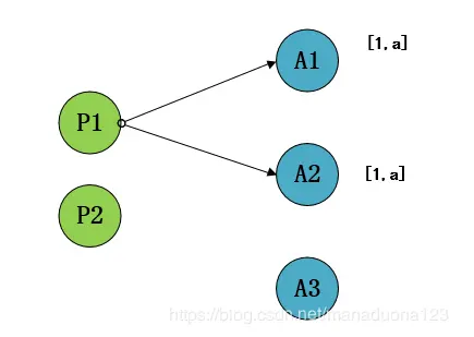 P1发送提议【1,a】至A1,A2 , A1,A2因为此时是第一个提议,所以接收提议,返回OK。