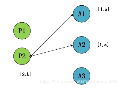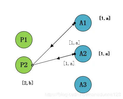 P2发送提议【2,b】至A1,A2 , 因为【2,b】大, A1,A2更新本地minProposal 返回OK。