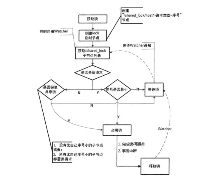 使用Zookeeper来实现分布式锁,主要实现排它锁和共享锁两种。