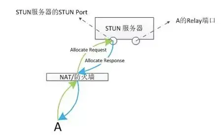 b) STUN服务器接收到客户端A的Allocate请求,服务器一看是Allocate请求,则根据relay端口分配策略为A分配一个端口。