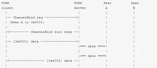 要将一个信道与对等端绑定,客户端首先发送一个信道绑定请求(ChannelBind Request)到服务器,并且指定一个未绑定的信道号以及对等端的地址信息。