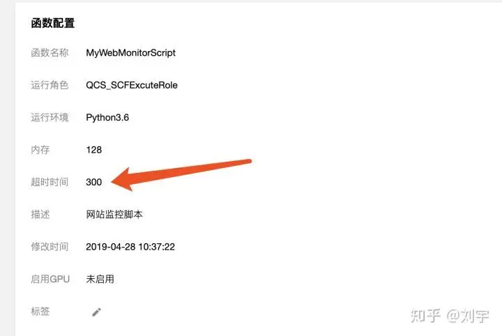 sendEmail("您的网站%s的状态:<br>%s" % (url, "<br>".join(final_list)), "service@52exe.cn")由于这个程序,可能运行的时间有点长,所以需要对云函数的timeout进行修改: