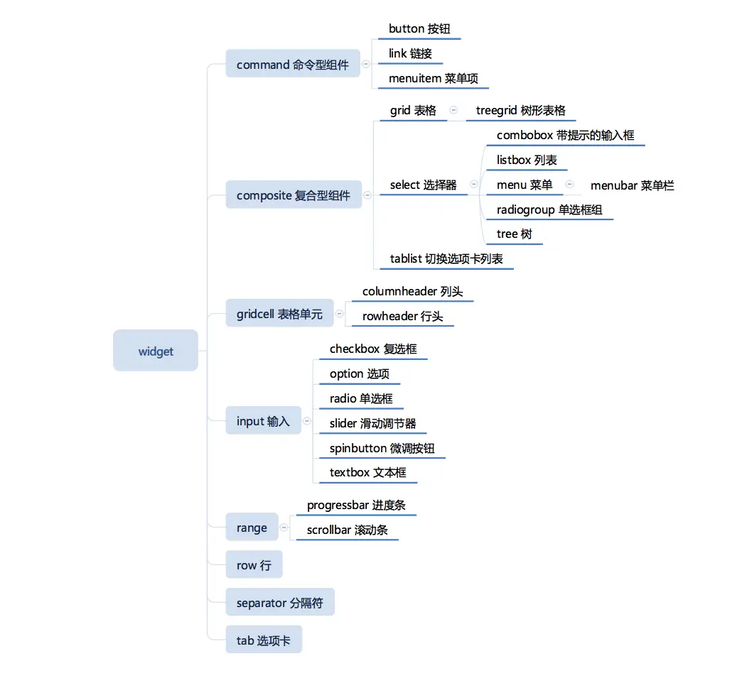 如果我们要实现一份组件库,这些widget role和它们对应的aria属性是非常好的参考。
