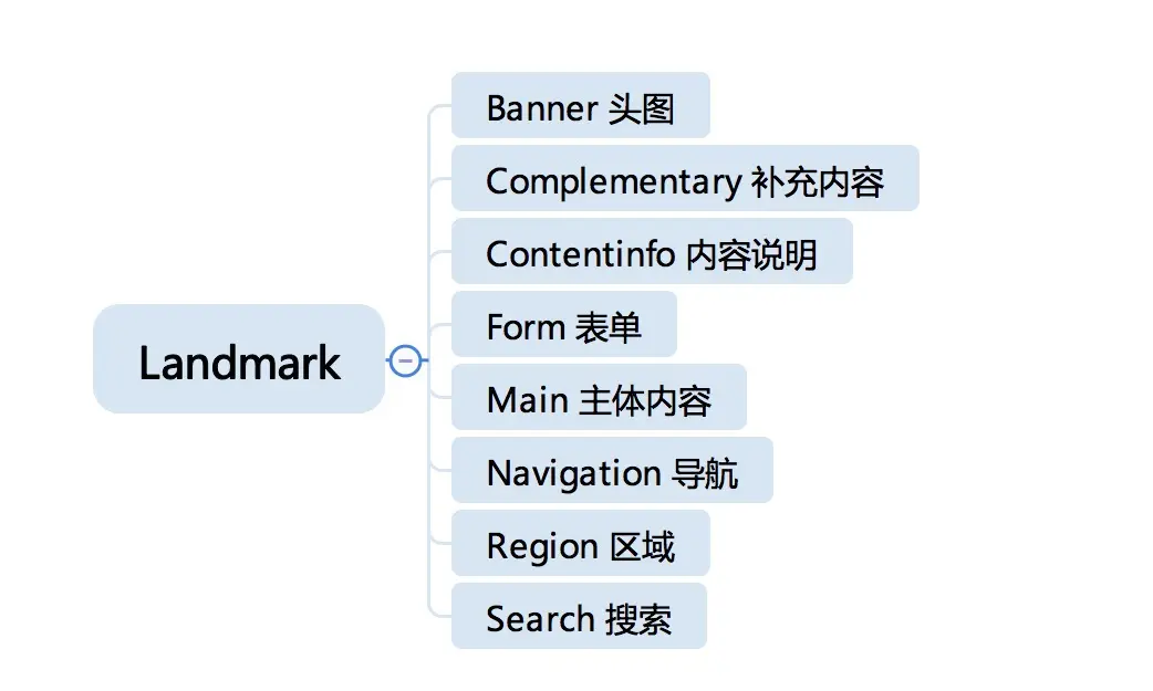 这里我们需要特别提出Landmark角色这个概念,Landmark角色直接翻译是地标,它是ARIA标准中总结的Web网页中最常见的8个结构,Landmark角色实际上是section的子类,这些角色在生成页面摘要时有很大可能性需要被保留,它们是: