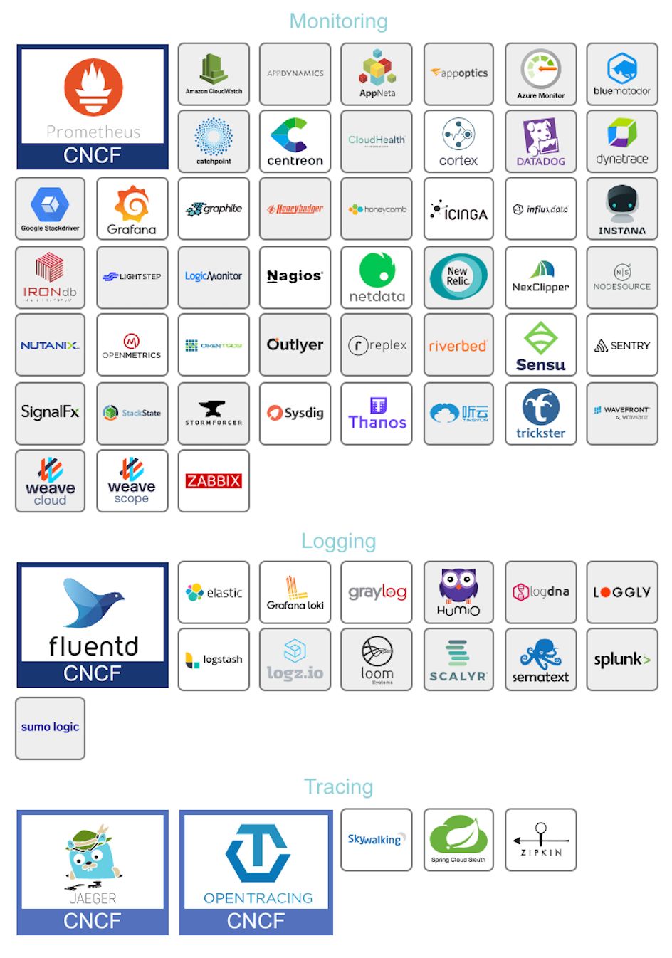 下面是 CNCF 总结的当前流行的实现可观察性系统的常见软件或服务,Monitoring 栏中以 Prometheus 为代表,本身可以实现 Metric 的收集监控,不过结合图中其他工具可以实现更加强大和完善的监控方案: